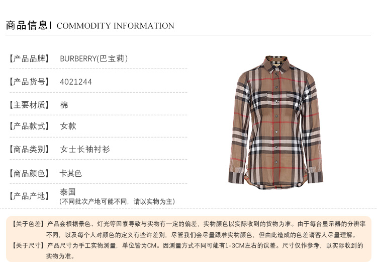 商品名称:巴宝莉 新品女款时尚长袖衬衫 4021244-售罄