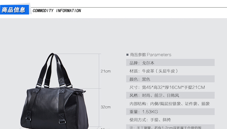 商品名称:都市休闲系列牛皮手提包男士大容量旅行斜挎包16090081