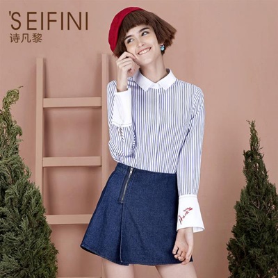 [支持深圳自提] 诗凡黎 新款韩版撞色领条纹显瘦衬衫 7160844221091