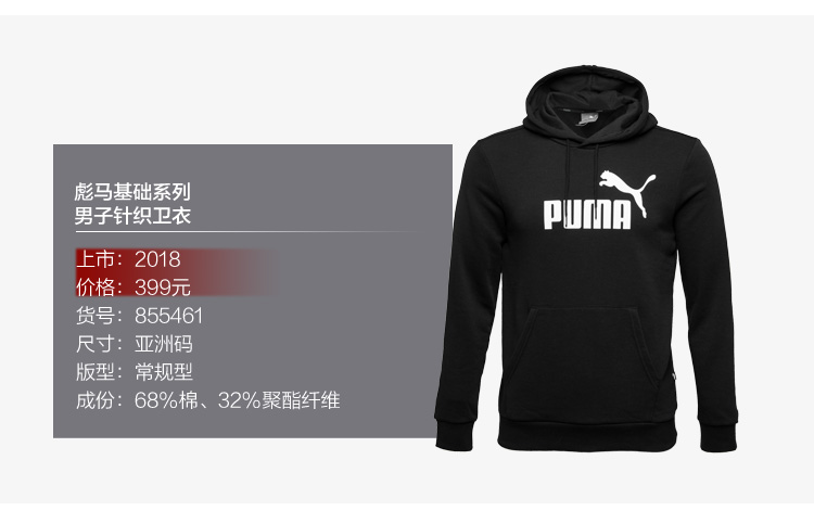 商品名称:PUMA彪马 2018秋季新款 男子休闲连帽卫衣 运动套头衫男装 855461